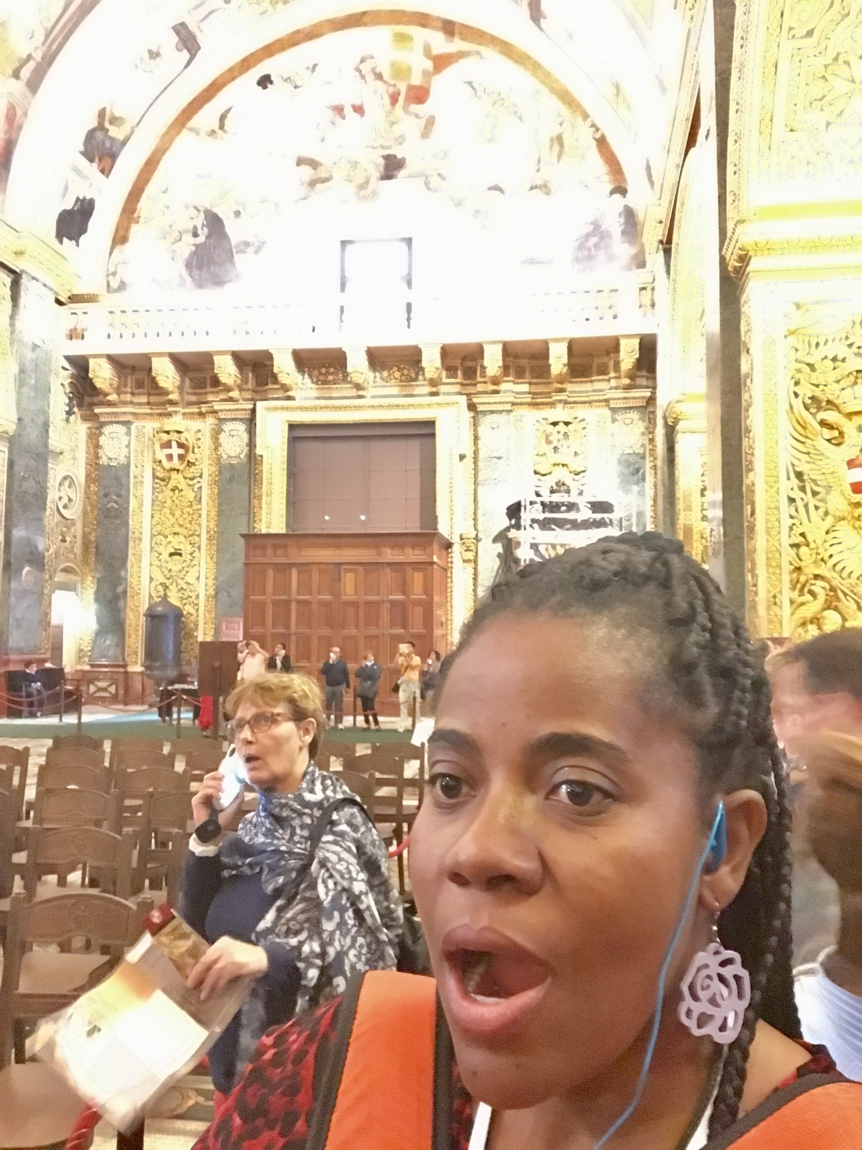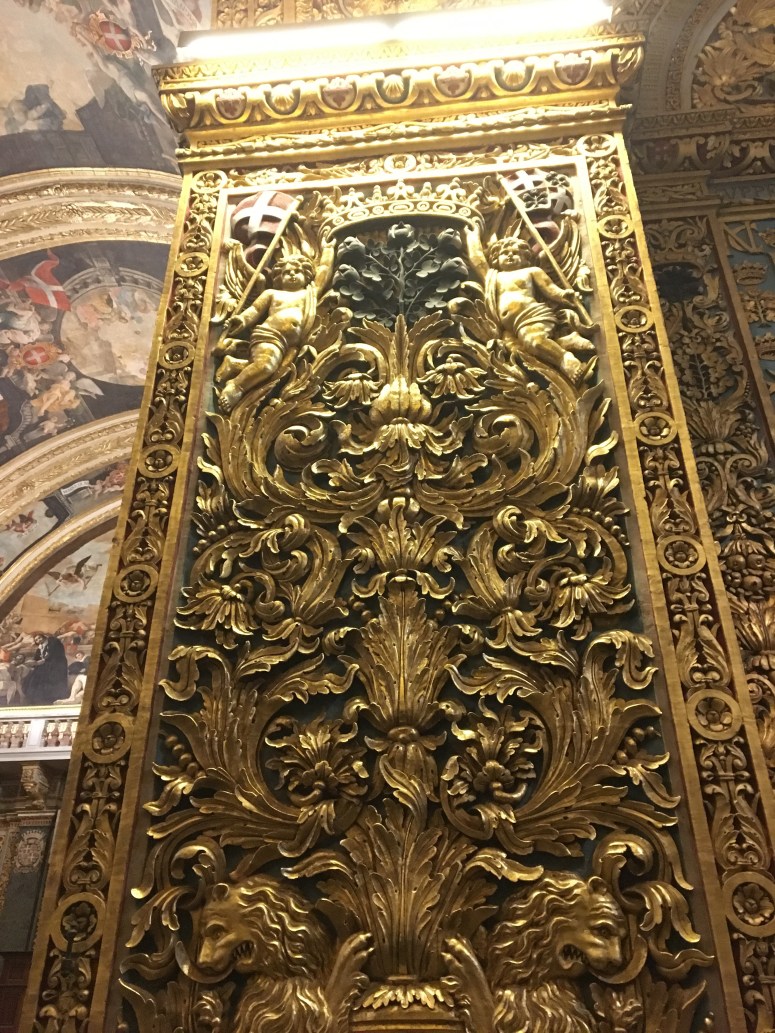 The cruise ship pulled into the natural harbor that is shaped like a man’s palm. We disembarked right after lunch. The charming guide proudly described the history of this tiny island. Our first stop was a short walk into the town of Valletta. We walked through the small, crowded streets lined with immaculate shops on either side of the streets. Our first stop was at the Church of Saint John’s Co-Cathedral which is a Roman Catholic co-cathedral in Valletta, Malta, dedicated to Saint John the Baptist. This is, by far, is the most ornate and beautiful church I have ever seen. Wow! As soon as we walked through the doors, we saw golden art and decor that celebrated the life of the disciple John. The high ceiling, with its icons and painted art were grandiose and exquisite. Every angle, every wall revealed the magnificent art and unimaginable decor. The floors were marble squares with inscriptions that detailed the saints who were buried under it. After experiencing this overwhelming beauty, we left the church.