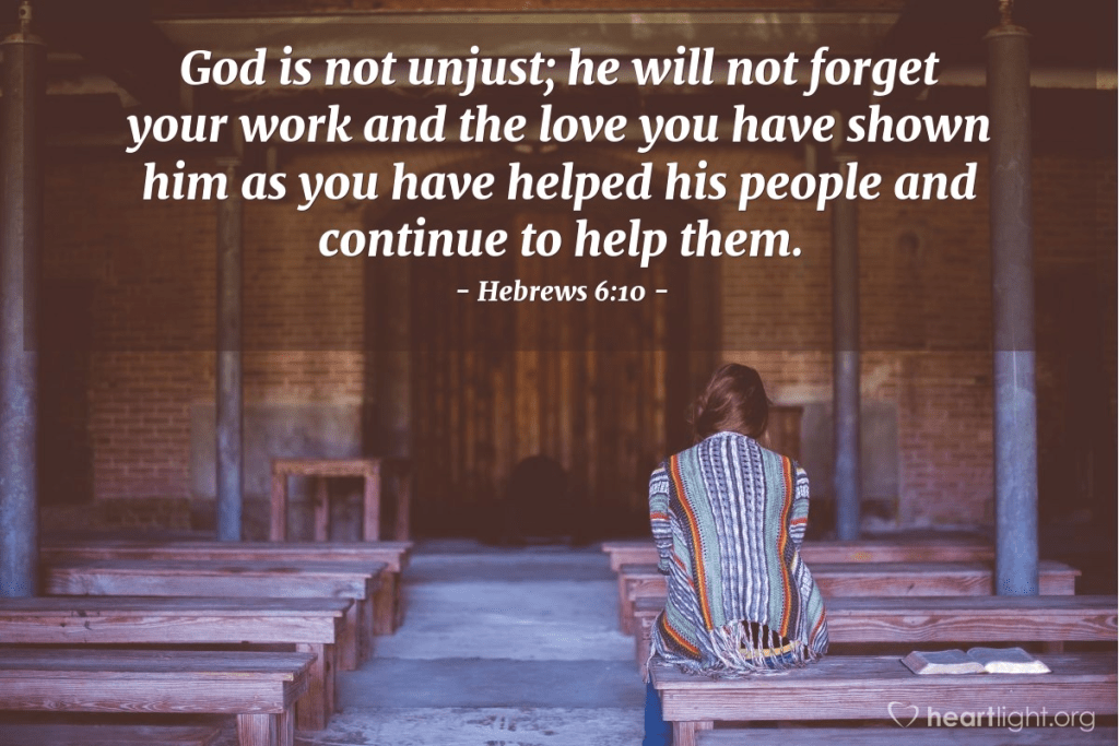 Hebrews 6:10 ‘God is not unjust; he will not forget your work and the love you have shown him as you have helped his people and continue to help
