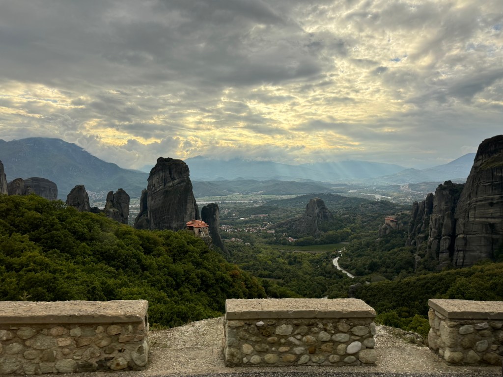We stayed overnight at the quaint and charming Hotel Meteora, situated directly across from the stunning Meteora rock formations. The rooms are elegantly decorated, and the three-course dinner was exquisite. Another beautiful day in Greece.